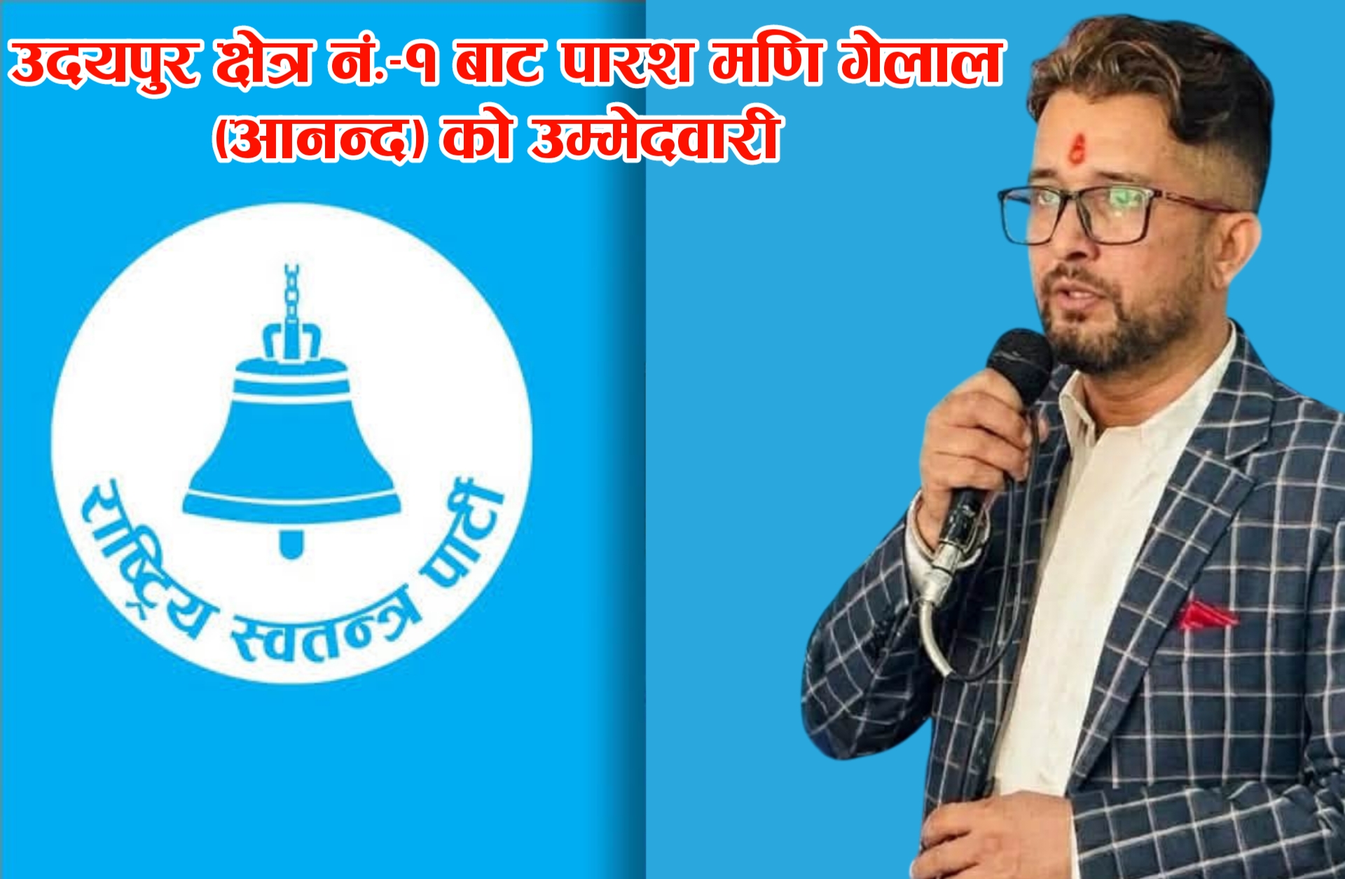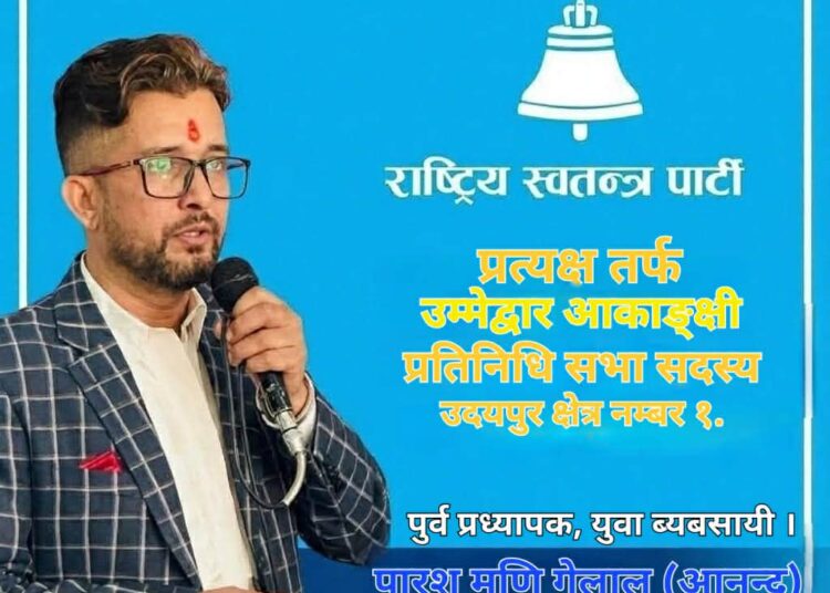 उदयपुर । राष्ट्रिय स्वतन्त्र पार्टीबाट उदयपुर क्षेत्र नम्बर १ का लागि प्रतिनिधिसभा सदस्य पदमा पारश मणि गेलाल (आनन्द) ले प्रत्यक्षतर्फ उम्मेदवारी घोषणा गरेका छन्। राष्ट्रिय स्वतन्त्र पार्टीका केन्द्रिय उद्योग तथा बाणिज्य विभाग सचिव केन्द्रिय निर्वाचन रणनिती कार्यदल – सदस्य समेत रहेका गेलाल “जननी जन्मभूमिश्च, स्वर्गादपि गरियसी” भन्ने मूल नाराका साथ उनी जनताको सेवामा समर्पित हुने प्रतिबद्धता व्यक्त गर्दै चुनावी मैदानमा उत्रिएका हुन्।