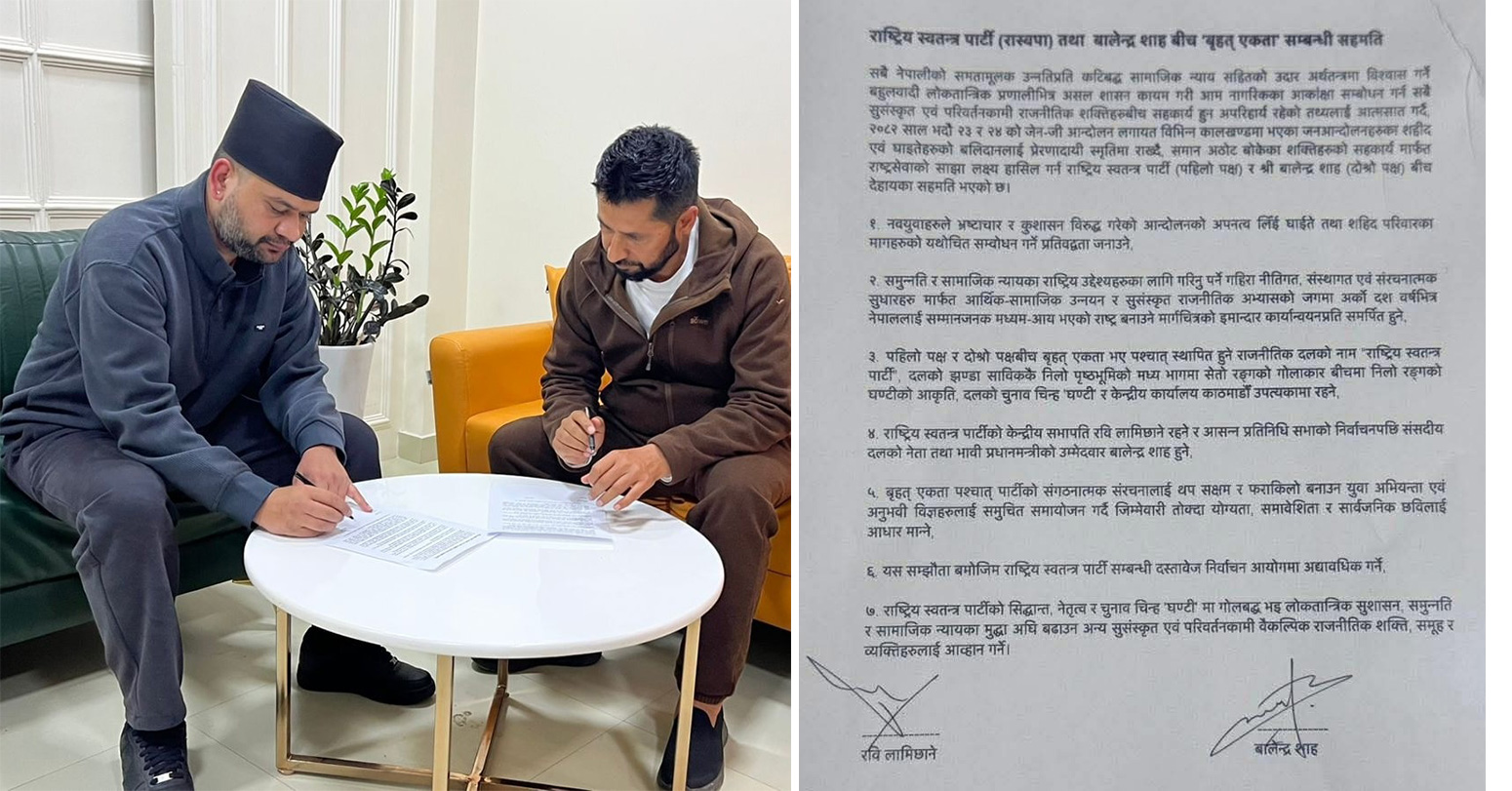 ‘बृहत एकता’ सम्बन्धी सहमतिमा सभापति लामिछाने र शाहले हस्ताक्षर गरेका छन् । सहमतिपत्रमा हस्ताक्षर पश्चात सभापति लामिछानेले सामाजिक सञ्जालमार्फत भनेका छन्, ‘सहमति भनेको नेताले खोजेको जस्तो होइन, देशलाई चाहिएको जस्तो हुनु पर्छ।’
