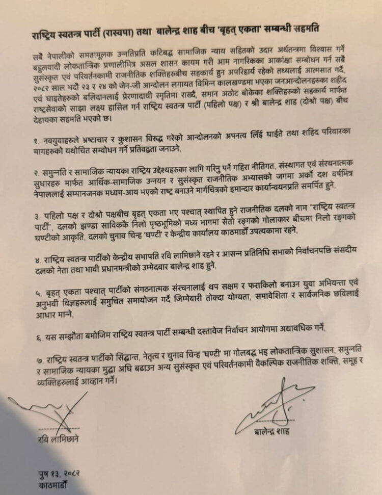 काठमाडौं । राष्ट्रिय स्वतन्त्र पार्टीका सभापति रवि लामिछाने र काठमाडौं महानगरपालिकाका मेयर बालेन्द्र शाहबिच ७ बुँदे सहमति भएको छ । सहमतिअनुसार लामिछानेले राष्ट्रिय स्वतन्त्र पार्टीको नेतृत्व गर्नेछन् भने बालेनलाई भावी प्रधानमन्त्रीकाे उम्मेदवारकाे रुपमा अघि सारिएको छ ।