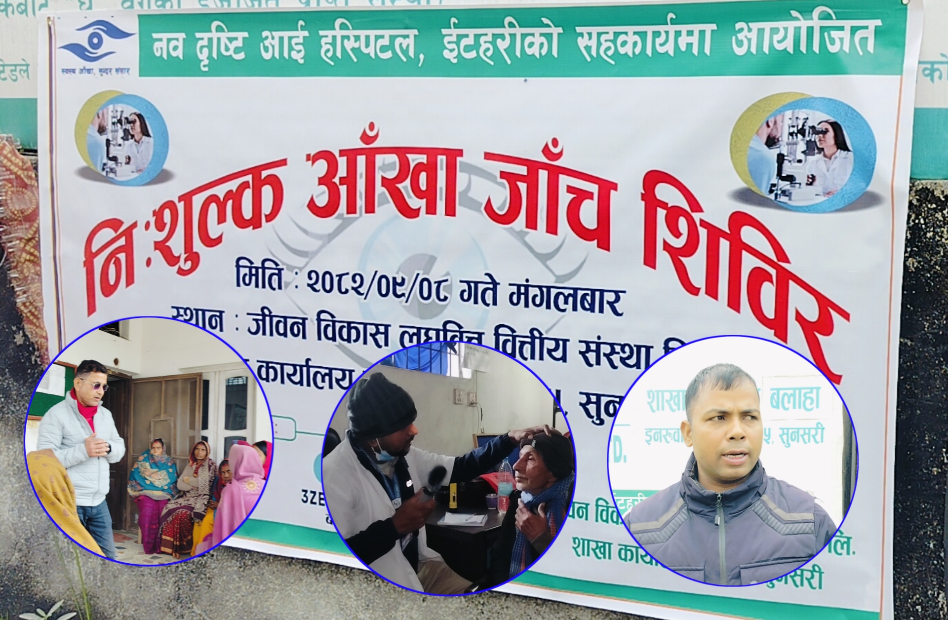सुनसरीको इनरुवा–५ स्थित जीवन विकास लघुवित्त वित्तीय संस्था लिमिटेडको शाखा कार्यालय बलाहामा पुस ८ गते मंगलबार आयोजित शिविरमा स्थानीय सर्वसाधारणको उल्लेख्य सहभागिता रहेको थियो। शिविरमार्फत २ शय जनाभन्दा बढी सेवाग्राहीले निःशुल्क आँखा जाँच,औषधी तथा परामर्श सेवा लिएका छन्।