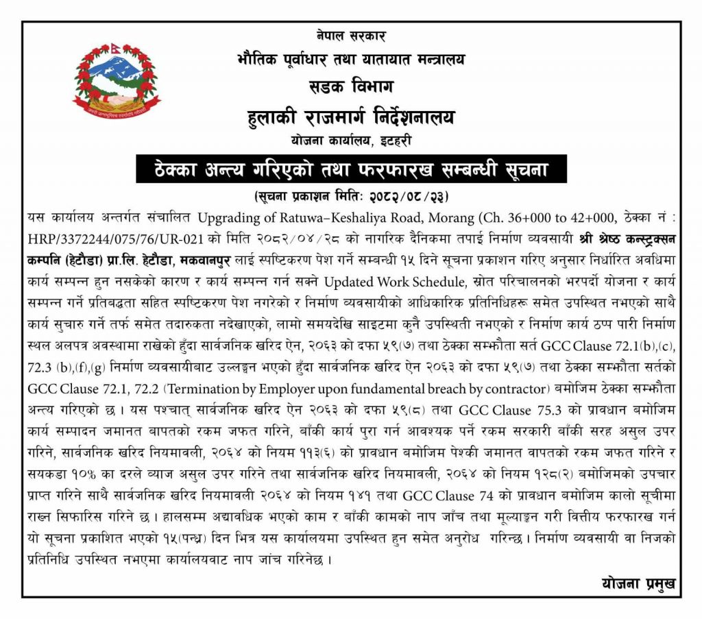 भाग मातहतको हुलाकी राजमार्ग निर्देशनालयअन्तर्गत योजना कार्यालय इटहरीले मंगलबार सडक निर्माणका लागि श्रेष्ठ कन्स्ट्रक्सन कम्पनी प्रा.लि. हेटौंडासँगको ठेक्का सम्झौता अन्त्य गरिएको सार्वजनिक सूचना जारी गरेको छ ।